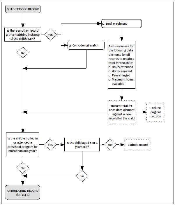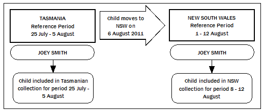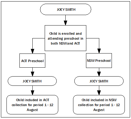 PROCESSING DATA FOR THE NATIONAL ECEC COLLECTION Figure 3.1: Child Episode Record to Unique Child Record For the purpose of reporting on hours enrolled, hours attended, maximum hours available and fees, child episode records are combined to obtain the total hours and total fees for children who are enrolled in multiple preschool programs. Identification of Unique Child Records Identification of unique child records can be achieved by application of a child/client database which contains detailed name, date of birth and address information for each child in a data set. Alternatively, a statistical linkage key (SLK) can be used to identify matching child records. Without a child/client database, the SLK can only provide estimated unique child records as it is possible for more than one child to have an identical SLK. For the National ECEC Collection, child records with identical SLKs were flagged and investigated by the jurisdiction in their child/client database. This process confirmed whether the matching SLK related to the same child enrolled in multiple preschool programs, or whether the SLK was a coincidental match (i.e. another child with a similar name). Alternatively, where a jurisdiction did not have a child/client database, matching SLKs were considered to be dual enrolments and combined accordingly into an estimated unique child record. The conceptual process which ensures that each child is only counted once for the total number of children enrolled and attending a preschool program is outlined in the diagram below. Figure 3.2: Creating a Unique Child Record Identification of Unique Child Records in the Year before Full-time Schooling Identification of unique child records in the YBFS can be achieved with 2 years of data collected using a URL data collection methodology and a child/client database. Where a child/client database is not available, the application of a SLK is used as an alternative unique identifier. For the National ECEC Collection, children who are enrolled for more than one year of a preschool program are identified and if these children are aged 5 or 6 years old, their records are excluded from the number of children in the YBFS. Four year old children who are enrolled in more than one year of a preschool program are not excluded because they would not have been attending a program intended for children in the YBFS in the previous year (i.e. they would have been attending as an eligible early entry child but not included in the count of children enrolled and attending in the YBFS). The conceptual process which ensures that each child is only counted once for the total number of children enrolled and attending a preschool program in the YBFS is outlined in the diagram below. Figure 3.3: Creating a Unique Child Record for the Year before Full-Time Schooling Concept For the 2011 National ECEC Collection, identification of unique child records using appropriate methods was achieved for some jurisdictions, however, for other jurisdictions it was not achieved. See Chapter 5, Jurisdictional Data Quality Statements for collection specific assessments. REASONS A CHILD COULD BE ENROLLED IN AND ATTENDING MULTIPLE PRESCHOOL PROGRAMS Below is a summary of the different ways that a child could be included more than once in the National ECEC Collection. Across jurisdictions When children move interstate during the reference period, they may still be on the enrolment list of their former preschool as well as on the enrolment list of their new preschool. In this situation, the child would be recorded legitimately in both jurisdictional data sets. In the 2011 collection this occurrence is significantly reduced, due to the alignment of collection reference periods for each jurisdiction. In 2011 the collection did not include any further reconciliation processes to further manage this occurrence Figure 3.4: Multiple Enrolments – Across Jurisdictions Cross border issues Where a child is enrolled in and attending two or more preschools in two separate jurisdictions (e.g. NSW and ACT), the child would be recorded in two different jurisdictional data sets. This could occur when a family uses a mixed preschool program delivery model that is located within different states/territories. Figure 3.5: Multiple Enrolments – Cross Border Issues This is an instance where a child is enrolled in and attending two preschools and subsequently this child would be included in both jurisdictional collections. Within a sector Where a child is enrolled in and attending two or more preschool programs within a sector, the child would be recorded for each enrolment within a jurisdictional data set. This could occur because a child’s family has decided to use two or more non-government services, two or more government services, or two or more LDCs, reflecting work life arrangements, or to increase their child’s preschool attendance hours. Figure 3.6: Multiple Enrolments – Within Sector When jurisdictions can collect data using a URL methodology and a child/client database and/or SLK is available, these records could be matched to produce a unique child record. Although this is an instance where a child is enrolled in and attending two preschools, this child should only be counted once within ‘Counts of Children’. Across sectors Where a child is enrolled in and attending two or more preschool programs across sectors the child would be recorded for each enrolment within a jurisdictional data set. This may occur because a child’s family has chosen to use a combination of government preschool, non-government preschool or preschool in an LDC, reflecting work life arrangements, or to increase their child’s preschool attendance hours. Figure 3.7: Multiple Enrolments – Across Sectors When jurisdictions can collect data using a URL methodology and a child/client database and/or SLK is available, these records could be matched and combined to produce a unique child record (See ‘Identification 