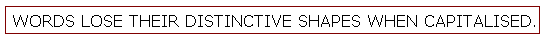 Whole words should not be set in capitals, as the words lose their distinctive shapes when they are capitalised, all becoming converted into rectangles. This makes reading and comprehension more difficult.