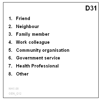 • Additional information: It is recommended that any information that the respondent does not need to read, such as office information (e.g. the question module and question number), be placed in the bottom corner, in font size 10 and in grey/drop-out colour, so that it does not draw the respondent's attention away from the main text (See Diagram 2.2). Office information should only be included if it will be useful for the interviewers. Information that may be useful to include here includes question numbers, question module identifiers, the survey name (abbreviated) and the year of the survey. Including this information is useful for interviewers in case the cards get out of order or mixed up with prompt cards from another survey, and need to be re-ordered.