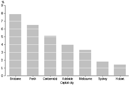 Growth of capital cities Within the capital cities, population growth has been uneven. The populations of some inner suburbs have declined as the people living there have aged and died, and their children have grown up and left. Meanwhile, the populations of other inner suburbs have grown due to urban renewal. Many outer suburbs have grown due to an influx of younger families to these areas. Between 1986 and 1994 the population living in capital cities grew by 10%. However, the annual rate of growth decreased over this period. In 1993-94 the annual growth rate of all capital cities was 0.8% compared to 1.6% in 1986-87. Between 1986 and 1994 the fastest growing cities were Brisbane and Perth with total growth of 19% and 18% respectively. However, their annual growth rates varied over the period. Perth grew most quickly in the early part of the period with annual growth rates of about 3% in the late 1980s. In the 1990s, the annual growth rate slowed and was 1.4% in 1993-94. Higher growth in the late 1980s compared to the 1990s was a common pattern for most capital cities. Brisbane was the only capital city whose annual growth rate was over 2% in 1993-94. Although its annual growth rate declined in 1989-1991 it never fell below the 1986-87 level. Canberra also experienced annual growth rates at around 2% in the early 1990s. However Canberra's growth rate declined to 0.9% in 1993-94. Darwin, Adelaide and Hobart continued to have low growth rates but Darwin was the only capital to have a decline in its population during this period. This was in 1987-88 when the population fell by 1.5%. This decline was the result of a large loss due to net migration. CAPITAL CITY POPULATION ANNUAL GROWTH RATES(a)