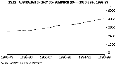 Total energy consumption in 1998-99 was 4,858 PJ, of which about two-thirds was delivered to final consumers and one-third lost in conversion, transmission and distribution. Graph 15.12 shows Australian energy consumption over the 25 years 1977-78 to 1998-99. Growth rates in total energy consumption over recent years (after a slowdown in the early 1990s) have been above the long term average for the 25 year period. Annual fluctuations are, to a significant extent, attributable to changes in Australia's rate of economic growth.