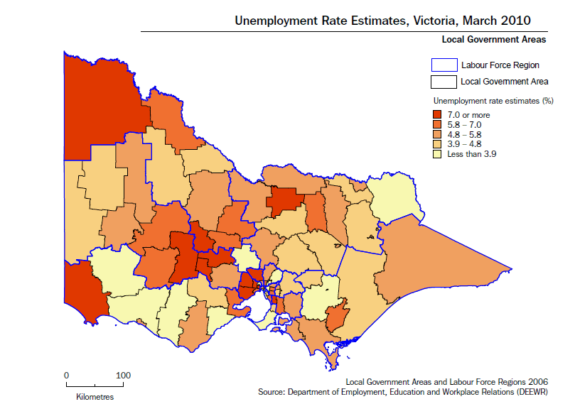 In March quarter 2010, the highest unemployment rates were recorded in the LGAs of Greater Dandenong (10.8%), Central Goldfields (9.6%) and Hume (9.3%), while the lowest unemployment rates were recorded in Nillumbik (1.8%), Macedon Ranges (2.8%) and South Gippsland (2.9%). In March quarter 2010, 46.3% of Victorian LGAs recorded an unemployment rate of less than or equal to 5.0%.