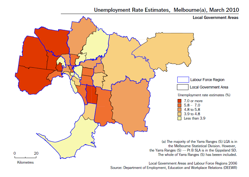 The Australian Government Department of Education, Employment and Workplace Relations (DEEWR) produce unemployment rate estimates at Statistical Local Area (SLA) level, using information derived from the ABS Labour Force Survey (LFS), supplemented by small area data from the ABS Census of Population and Housing and Centrelink.