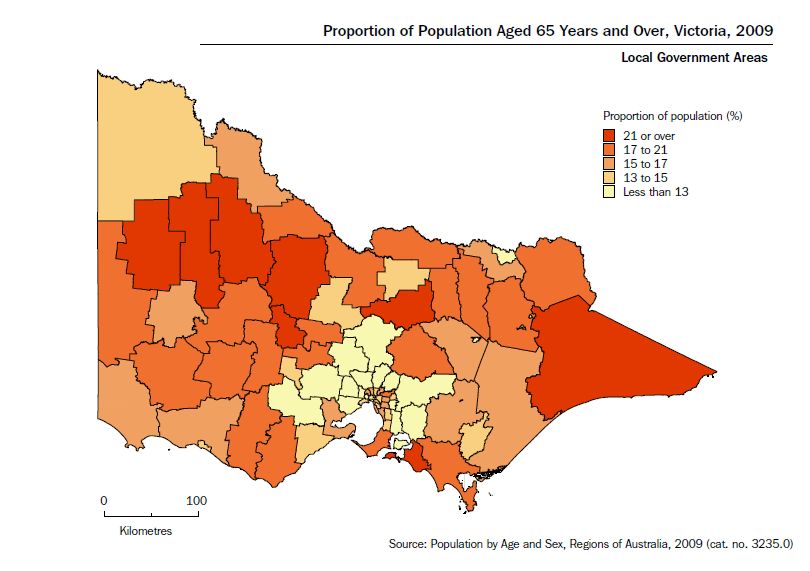 POPULATION AGEING IN VICTORIA The proportion of population aged 65 years and over varied among Statistical Divisions (SDs) in Victoria. In both 2004 and 2009, MSD recorded the lowest proportion of people aged 65 years and over (12.5% in 2004 and 12.6% in 2009). In both periods, the largest proportions of population aged 65 years and over were recorded in Wimmera and East Gippsland. In 2009, Wimmera had the highest proportion (19.9%) of population aged 65 years and over. Between 2004 and 2009, all SDs experienced an increase in the proportion of population aged 65 years and over. The East Gippsland SD experienced the largest increase (1.7 percentage points) in proportion of population aged 65 years and over followed by Ovens Murray (1.4), and Goulburn and Gippsland (both 1.3). The smallest increases were experienced by Melbourne (0.2 percentage points), Barwon (0.4) and Western District (0.7). Among Victoria's Local Government Areas (LGAs) the highest proportion of people aged 65 years and over at 30 June 2009 was recorded in Queenscliffe (B) (32.4%) followed by Hindmarsh (S) (24.9%) and Yarriambiack (S) (24.4%). Queenscliffe also recorded the highest proportion (30.0%) in 2004. The fifteen LGAs with the highest proportion of people age 65 years and over are all located in BoV. Melbourne (C) (5.6%), Melton (S) (5.9%) and Wyndham (C) (6.0%) recorded the lowest proportion of persons people aged 65 years and over in 2009. Fertility Rates The total fertility rate (TFR) is the sum of age-specific fertility rates (live births at each age of mother per female population of that age), divided by 1,000. It represents the number of children a female would bear during her lifetime if she experienced current age-specific fertility rates at each age of her reproductive life. Since 1971 there has been an overall decrease in fertility rates for both Australia and Victoria. Fertility rates for Victoria have been slightly lower than the national rate for the entire period (1971 to 2008). From 1980 to 2002, the Victorian rate has shown volatility (from 1.610 in 2001 to 1.863 in 1990) and from 2003 it has started to increase, reaching 1.861 in 2008. Life Expectancy Life expectancy has an impact on the age profile of a community and the following graph shows the pattern of life expectancy at birth for males and females in Victoria from 1988 to 2008. Over the period, life expectancy at birth for males increased by 6.0 years, from 73.6 to 79.6 and female life expectancy increased by 4.0 years from 79.9 to 83.9. In 1988, the difference between male and female life expectancy was 6.3 years, however, the difference has narrowed over the last two decades to 4.3 years in 2008.
