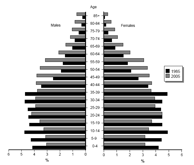Figure 5.4 shows the ageing of the ACT population between 1985 and 2005. In 1985, there were proportionally more people aged under 40 years in the ACT compared to 2005.