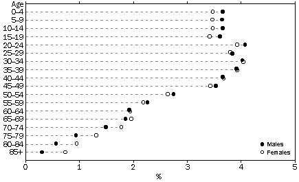 Source: Australian Demographic Trends (cat. no. 3102.0) The early decades (1901-1945) From the turn of the century until World War I (1901-1913) the average annual growth rate was high at 2.3%. This was due to a high birth rate, and high net overseas migration in the latter part of the period. In 1911, the year of Australia's first national census, Australia had a young population whose age-sex profile had been formed by a long period of high fertility and high mortality. Almost 12% of the population were under 5, and only 4% were aged 65 or over. The median age was 24 years. During World War I, disruptions to civilian migration caused a decline in net migration. Growth from natural increase also declined steadily, from 1.8% in 1914 to 1.1% in 1919. This was due to a fall in the crude birth rate, and a rise in the crude death rate. Average annual population growth rates fell from 2.3% in the period 1901-13 to 1.4% in the period 1914-1919. Growth rates recovered in the post-war period, despite a fall in the crude birth rate. Annual growth rates averaged 2.1% in the 1920s. The increase in growth rates during this period was associated with increasing levels of migration to Australia following World War I. The economic collapse in 1929 and the depression during the 1930s led to a sharp decline in growth rates, falling to an average of 0.9% in the period 1930-1938. This decline in growth was associated with low levels of net migration, and a sharp decline in the crude birth rate. This fell to 16.4 per 1,000 population in 1934, the lowest rate recorded up to that point in the century. It did not fall to this level again until 1976. The rate of growth from natural increase fell to 0.7% in 1934 and 1935, the lowest rate recorded this century. During World War II annual growth rates remained relatively low, averaging 1.0% for the period 1939-1945. While the crude birth rate increased during the war years and the population grew through natural increase, growth through net migration was low. ACTUAL AND PROJECTED POPULATION Source: Australian Demography; Australian Demographic Statistics (cat. no. 3102.0); Projections of the Populations of Australia, States and Territories 1993 to 2041: Series A (cat. no. 3222.0) COMPONENTS OF POPULATION GROWTH Source: Australian Demography; Australian Demographic Statistics (cat. no. 3101.0); Australian Demographic Trends (cat. no. 3102.0); Projections of the Populations of Australia, States and Territories 1993 to 2041: Series A (cat. no. 3222.0) The post-war period (1946-1960) The post-war period from 1946-1960 saw high annual growth rates averaging 2.7% per year. Migration was an important component of this growth with the government actively encouraging migration to boost Australia's population. During this period net overseas migration added 1.2 million people to the population, many of them Europeans displaced by World War II. 43% of this increase occurred during the four years from 1949-1952. Despite the high contribution of net migration, most of the growth during this period was due to natural increase, the well-documented 'baby boom'. This could more appropriately be termed a 'marriage boom'. A greater proportion of the population married and had children, and women were starting and completing their childbearing earlier2. The proportion of women aged 15 and over who had ever married increased from 64% in 1921 to 79% in 1961 (see Australian Social Trends 1995, Trends in marriage and divorce). Despite individual women having fewer children, a large number of children were born during this period because an increasing proportion of women had children (see Trends in fertility). CRUDE BIRTH AND DEATH RATES(a) (a) Rates per 1,000 population. Source: Australian Demography; Australian Demographic Statistics (cat. no. 3101.0); Australian Demographic Trends (cat. no. 3102.0); Projections of the Populations of Australia, States and Territories 1993 to 2041: Series A (cat. no. 3222.0) The sixties and seventies (1961-1980) Population growth remained relatively high during the 1960s, averaging 2.1% per year. Rates of natural increase and net overseas migration eased back slightly from the high levels of the post-war period. Part of the decline in natural increase is attributed to the availability of oral contraception from 1961. Growth rates fell sharply in the first half of the 1970s, from a peak of 2.1% in 1970 to 1.0% in 1975. The average annual growth rate for the 1970s was 1.5%. Levels of net migration declined as the economy slowed and employment opportunities contracted. During the same period there was a decline in fertility. By the end of the 1970s fertility levels were even lower than those during the great depression, and were below replacement level (the fertility level required for a population to replace itself without immigration in the long-term). This decline was associated with social and economic developments, including higher levels of education and increasing numbers of women entering the labour force. Mortality rates were also falling, although at an insufficient pace to offset the fall in fertility, leading to a fall in growth due to natural increase from 1.2% in 1970 to 0.8% in 1980. Recent developments (1981-1994) Australia's population increased from 15.1 million at the end of 1981 to 18.1 million in June 1995. Average annual growth rates declined in this period, falling from 1.7% in 1981 to 1.0% in 1994. Australia's average annual growth rate for the period 1990-95 of 1.2% was lower than the world average annual rate over this period (1.6%), but similar to the rates of a number of other countries such as the USA, New Zealand, China, Singapore and Thailand5. The rate of growth due to natural increase continued to decline between 1981 and 1994, with fertility remaining below replacement level and death rates declining at almost all ages. The rate of growth due to net migration fluctuated considerably during this period, recording some of the