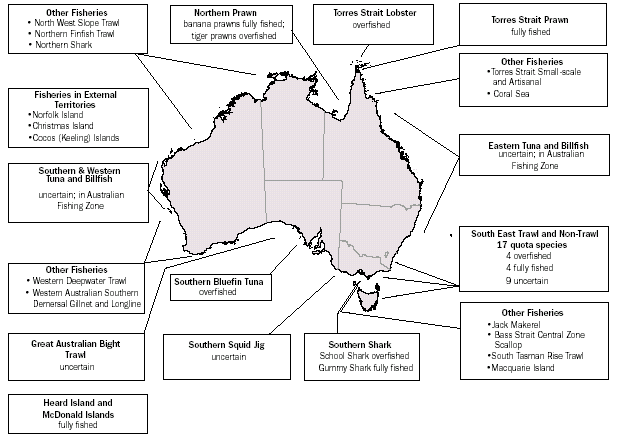 The status of Australia's Commonwealth managed or jointly managed fisheries resources is summarised in map 17.14.