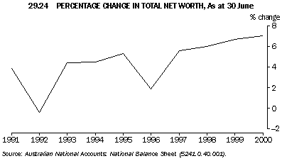 Australia's net worth at 30 June 2000 is estimated at $2,431.4b, an increase of $159.8b (7.0%) since June 1999. Of the increase, $22.5b was due to transactions (both capital and financial), and $137.3b was due to revaluations and other flows (including discoveries of subsoil assets). The average annual rise over the period 30 June 1992 to 30 June 2000 was 5.2%. Net worth relative to annual GDP has fallen from 4.0:1 at the end of June 1992 to 3.8:1 at the end of June 1996, and has maintained this ratio since. Graph 29.24 shows that the net worth series exhibited the strongest growth during the years 1996-97 to 1999-2000 when annual rates of over 5% were achieved.
