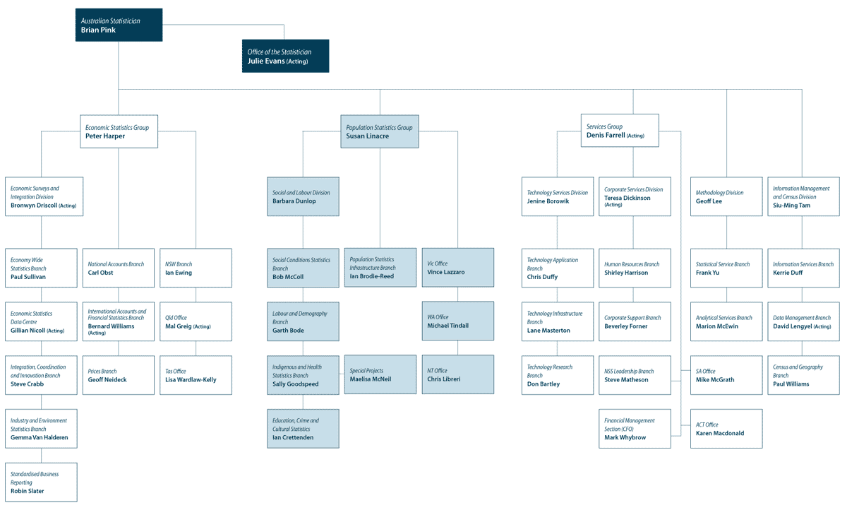 ORGANISATIONAL STRUCTURE The ABS is led by the Australian Statistician - a statutory office established by the Australian Bureau of Statistics Act 1975. The Statistician completed a review of the ABS’ structure during the first half of 2007, with the new structure in place from 2 July 2007. For more information on the review see Chapter 1 Australian Statistician’s review of 2006–07. During 2006–07, the statistical operations of the ABS were divided into two groups: Economic Statistics Group and Population Statistics Group. Each group was headed by a Deputy Australian Statistician, with the support of a First Assistant Statistician leading the Economic Surveys and Integration Division for the Economic Statistics Group, and another leading the Social and Labour Statistics Division for the Population Statistics Group. A third Deputy Australian Statistician has been leading the Services Group, with responsibility for meeting the ABS’ other business objectives. This group has had First Assistant Statisticians leading the Technology Services and Corporate Services Divisions. The Methodology and the Information Management and Census Divisions reported directly to the Australian Statistician. The Office of the Statistician is responsible for key corporate functions, which support the Australian Statistician’s administrative and statistical roles. The ABS has a central office in Canberra and regional offices located in the eight state and territory capitals. All regional offices, apart from the ACT office, have some responsibilities for national statistical activities. Regional offices are also primarily responsible for the delivery of statistical services to their state or territory. These offices have ongoing engagement with state and territory governments on statistical services and priorities through state and territory committees set up for that purpose and other consultation processes. In Western Australia, South Australia and Tasmania, the Regional Director administering the ABS regional office is also the State Government Statistician. All Regional Directors have a direct reporting line to a Deputy Australian Statistician (see organisational chart below for more detail). Organisational Chart (as at 30 June 2007)
