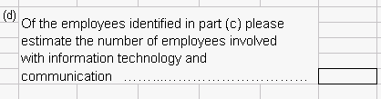 General Construction and Layout There should be an additional "E" at the end of all form IDs on the front of form to clearly indicate, in the Forms Repository view, that it is the Excel version of the paper form. If an "E" is already used in the form name, then use an "X" at the end. Layout of Excel form content is based directly on the paper form. This includes all instructions and notes except any paper-specific ones. For example, "Tick all that apply" should be replaced with "Please indicate with an 'X'..." and references to reply paid envelopes should be removed. The text of notes, definitions and instructions should align under the first letter of text, not under the dotpoint. However, this preferred formatting should only be done where practical, and where time permits. The bottom edge of response boxes should align with the text, or with the last line of text for questions with more than one line of text. In order to achieve this, you may have to use merged cells for the question text. For example: Diagram 3.1 It is possible to merge a number of cells across rows and columns in order have enough space to fit the question without the need to increase row heights. Using tall row heights for questions makes it impossible to align response boxes with the question text, so this practice should be avoided where possible. Response boxes should be correctly aligned because it makes it easier for the respondent to identify the correct place of response. Diagram 3.2 shows an example of the use of merged cells with and without formatting. The merged cells are identified by the lack of grid lines: Diagram 3.2 Forms are designed at a screen resolution of 800x600 to accommodate the lowest resolution in widespread use, and, allowing for the white space at the bottom of worksheets, so that they print off to closely resemble their paper equivalents. BSCs have the option to include comments boxes at the end of each part (worksheet) to enable the respondent to document any problems or concerns at the time they occur. This is currently a feature of the Local Government Finance (LGF) Excel form. For example: Diagram 3.3 If comment boxes are used, then the BSC's business process and IT systems may be affected, and the BSC should be made aware of this so that they can plan to identify and deal with the extra information being collected. Macros There are two types of Macros used for Excel forms, the first are form formatting macros used by the form developers to construct the form, protect it etc. These should not be stored in the form. The second type of Macro is meant for use by the respondent, and is stored within the form workbook. Note that Excel forms should not include macros unless there is a specific need that can only be achieved by using a macro. Such a macro is "Add Rows" in the IFAB Form 90 Excel workbook. These macros are developed by TA for ESG. Such macros should undergo extensive testing with providers and ABS processes (Secure Deposit Box). Note: care is required as some macros will not pass through our security systems and/or the provider's security. Macros for use by the respondent and represented by a button in the worksheet should be positioned intuitively. For example "Add Row" should be positioned at the end of the last row and column, where the respondent would already be looking when the need for additional rows arises. Buttons should not appear at the top of columns where they can be confused with column headings. Diagram 3.4 shows an example of where a button should be placed in relation to the relevant response box: Diagram 3.4 Worksheets and Sections All Excel forms are divided into worksheets of varying length that represent the sections or parts of the paper form. The main use and features of the worksheets will be described below. Excel forms may use more parts and sections than the paper form equivalents to aid navigation and for convenience in assembling the form. It can be easier to have standard parts (Please read first, How to use this form, How to submit, Time taken) separate, so that they can be inserted as a sheet into new forms. All forms should start with a standard 'How to use this form' worksheet about navigation and saving, followed by the 'Front of Form' and 'Please read this first' worksheets. For long forms, a 'Content' worksheet should be included after the 'Please read this first' sheet. This describes where to find the relevant sections, for example: Diagram 3.5 Each Part or Section has an Excel 'tab' at the bottom of the screen that can be used to navigate between worksheets. Tabs should be labelled with the part headings, not the part numbers (or letters). The exception to this rule is for a survey with a large number of worksheets, such as the Survey of International Investment (SII), where it is not practical to use the full part heading for every worksheet tab. The following example shows how the tabs should be labelled: Diagram 3.6 This example shows how tabs are labelled when there are a large number of worksheets: Diagram 3.7 If there are simply too many sheets to avoid some of them scrolling out of view horizontally, an additional instruction should be included in the 'How to use ..' section: Diagram 3.8 Inside a given section/part/worksheet the content is displayed in one scrolling 'page', though in some cases this results in only a portion of the screen being used. Subsequently, references to paper form page numbers are removed and inter-page gaps and spacing adjusted to give an even, continuous, display. Each worksheet ends with a note to the effect that it is the end of that worksheet. 'End of part' notifications should be placed in the bottom right hand corner of the 'page'. The natural navigation of the eye will make this area of the worksheet the last part viewed by the respondent. By putting the 'End of part' notification there, respondent eye movement is reduced. The 'End of part' notifications should also be meaningful by describing w