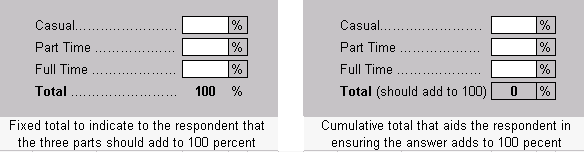 Greyed out cells for fixed totals should be visually different from greyed out cells for cumulative totals. In particular, cells that have a fixed total value for reinforcing how the question should be answered, for example "100 %", should be differentiated from those that cumulatively total. As shown in diagram 3.11:
