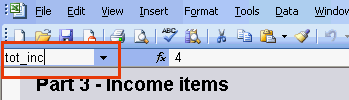 Diagram 3.12 A numeric format still allows text entry, but will left justify instead of right. Therefore, respondents are still able to enter a 'nil' response if they wish. Diagram 3.13.1 Diagram 3.13.2 Back to top Dimensions, Margins and Borders ABS Excel forms are designed to print out to the width of an A4 form, but absolute dimensions lose most of their meaning when using different screen and window sizes, fonts and resolutions. Excel measures cell width in terms of standard font characters, as specified in Microsoft Excel Help (2003): "The number that appears in the Standard column width box is the average number of digits 0-9 of the standard font (standard font is: The default text font for worksheets. The standard font determines the default font for the Normal cell style (Microsoft Excel Help, 2003)." The ABS Excel templates use a 'standard font' of Arial 10 point. Column widths must vary from sheet to sheet to allow for a variety of layouts. There are a number of different column settings for different page layouts, these are partly automated through the formatting macros, and can be adjusted for the needs of the form. The width of margins are relevant to printing only. Minimum margin requirements vary from printer to printer and can be altered in: <File>, <Page Setup> then <Margins>. The top and bottom margins are set to at least 1cm. Cell borders are set to the finest solid black line for data entry cells, and the second finest for white borders. Diagram 3.14 Radio Buttons and drop down menus The use of radio buttons and drop down boxes in Excel forms is under consideration. Radio buttons may be used for mutually exclusive yes/no or choose one only questions. One advantage of using a radio button is that the round shape of the response spaces help to differentiate mutually exclusive type questions from 'tick all that apply' type questions. Drop down boxes do not work as well and should only be used sparingly for lists of response items. Long lists in drop down menus are problematic due to the need for scrolling, when using drop down menus the entire list should be visible when activated, i.e. without the need for scrolling. Drop down menus share the same risk of ordering effects as printed lists, for example, respondents tend to answer in the top third of the list. If there is some natural order to the items in the list, this order should be used, otherwise the list should ordered alphabetically. These tools should not be used unless thoroughly tested with providers. Tagging/naming data items In the future eforms will be required to have a 'named range' defined for each single entry field or column of entry fields. The 'named range' is given a unique label so that any individual entry field can be retrieved. The names used for the 'named range' will be important in reducing the amount of concordance work done between exporting data from the eform and the eventual load process to the Input Data Warehouse (IDW). The Blaise system name should be matched to each data cell. The Collection Management Unit should be consulted when tagging an Excel form. To name a cell(s) select and highlight the relevant cell(s). Go up into the name box located on the left side of the screen under the toolbar. As shown in Diagram 3.15, type a name for the cell(s) then press enter to save the name. For example: Diagram 3.15 Alternatively you can open the 'Name' dialogue box by choosing <Insert>, <Name> then <Define> from the main menu as is shown in Diagram 3.16. Type a name in the "Names in workbook:" box, then go to "Refers to:" box, delete the reference that appears, if any, then using the mouse highlight the relevant cells. For example: Diagram 3.16 Additional to cell tagging, each data sheet should be tagged with an embedded ID and both data sheets and the Front of Form sheet should have an ETL-PIMS metadata ID.