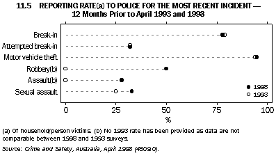 Crime is not always reported to the police, with many factors influencing whether or not a crime is reported. In particular, rates of reporting to the police vary depending on the type of offence, as shown in graph 11.5. People are much more likely to report crimes against property to the police (a requirement for any associated insurance claim) than crimes against the person (i.e. assault or sexual assault). The five year period to 1998 saw an increased willingness for victims of sexual assault to report their assault to the police.