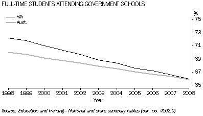 - In 2008, there were 350,000 primary and secondary students attending schools full-time in Western Australia. Two-thirds (66%) of these students were attending government schools, similar to the national average (66%). Over the past decade the proportion of students attending government schools in Western Australia has steadily declined from 72% in 1998.