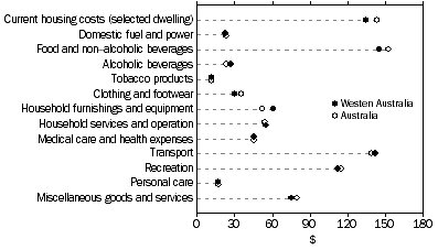 In 2003-04, average weekly household expenditure was 7.1% ($60) higher in Perth ($894) than for the balance of the state ($834). This is considerably less than the disparity recorded nationally (19% or $149) between households in capital cities ($947) and elsewhere in Australia ($798). A possible reason for this is that incomes in regional and remote areas of Western Australia are on average higher than in other parts of rural Australia due to the significance of the mining industry.
