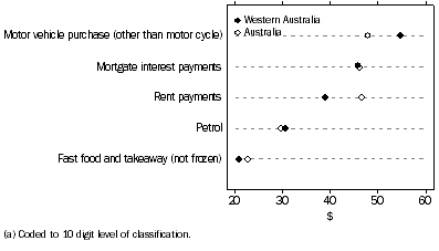 The purchase of a new or used motor vehicle is typically a large lump sum expense incurred by some households. In average weekly terms, the purchase of motor vehicles represented the single largest expenditure item for Western Australian households in 2003-04 ($55). Other high expenditure items were mortgage interest payments ($46), rent payments ($39), petrol ($31) and fast food and takeaways (not frozen) ($21). These items were also the top 5 nationally although the order was slightly different, with Australian households spending slightly more on rent payments ($47) than mortgage interest payments ($46). Western Australian households on average spent notably more on motor vehicle purchases ($55 compared to $48) but less on rent payments ($39 compared to $47).