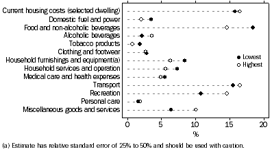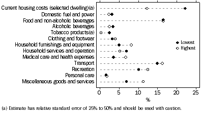 There were many differences in the composition of household expenditure for households in the lowest and highest equivalised income quintiles. Those in the lowest quintile spent proportionally more on basic goods and services including food and non-alcoholic beverages (18% compared with 15%) but less on discretionary items like recreation (11% compared with 15%).