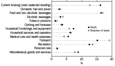 Housing and transport expenses contribute most to differences in the composition of spending for households in Perth and the rest of the state. In 2003-04, households in Perth spent a higher proportion of their expenditure on current housing costs (16% compared to 13%) and household furnishings and equipment (7.3% compared to 5.8%). In contrast, transport (19% compared to 15%) made a larger contribution to household expenditure for households elsewhere in the state.