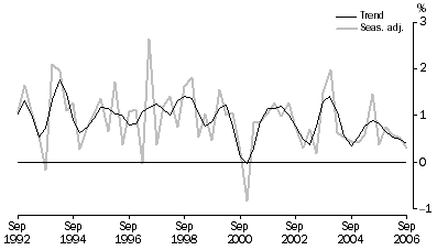 In both trend (-1.0%) and seasonally adjusted (-0.9%) terms the Household saving ratio was negative in September quarter 2006, implying that household consumption was greater than household disposable income.