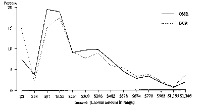 A significant difference noted between the 1986 Census results and the August 1989 Test was the decrease in the proportion of people giving responses coded to 'Other'. This was also observed in the July 1992 Test. The proportion of people who marked 'Other' was much smaller on the OMR form than the OCR form, while the proportion in each of the listed categories (except Greek Orthodox) was much greater. This may indicate that, on OMR forms, people either marked a response that seemed appropriate or were prompted by the list to give a response they would not have given otherwise. The proportion of people who stated that they had 'No religion' on the OMR form was much greater than that on the OCR form. Both forms included a specific instruction directed at those without a religious affiliation. Separate testing of non-response indicated that the level of non-response was significantly different between the OMR and OCR forms. This indicates that people without a religious affiliation who would not have bothered to answer a write-in question may have marked the 'No religion' response on the OMR form. Thus, the presence of this response in the list may have resulted in a lower non-response rate. Census results also show a lower non-response rate for Religion in the 1991 Census compared to the 1986 Census. Another factor which may have contributed to the lower level of non-response on the OMR form, compared to the OCR form, may be that some people with a weak religious affiliation did not bother to write-in a response on the OCR form. Income, Year of Qualification, Year of Arrival, Hours Worked The response categories for these four questions were completely self-coded on the OMR form and appeared as an ascending numerical scale. There did appear to be a list effect as, for each of the variables, the greatest differences between the July 1992 Test OMR and OCR forms were for the top and bottom categories. The differences for each question are discussed below. The graph below shows the distribution of responses for Income for the OMR and OCR forms. This graph shows that the difference in the proportion of responses for the OMR and OCR forms was greatest for the lowest categories (Less than $58, $58-$96 and $97-$154), for $309-$385, and for the highest category (More than $1346). It also shows that, although the difference was not always significant, for categories $578-$673 and higher, the proportion of people was consistently greater on OCR forms than OMR forms for these categories. DISTRIBUTION OF RESPONSES FOR INCOME This indicates that there was a list effect, possibly in three ways. Firstly, it is possible that people were less likely to mark the extreme categories in the OMR list (that is, the highest or the lowest). Secondly, the presence of the list could have given people a concept of 'high' and 'low' incomes and may have influenced some people (for example those concerned about imagined comparisons with income declared to the Taxation Office) to mark a lower response than they would have without the list. This second effect was not supported by significant differences but the proportion of responses on the OCR form in these categories tended to be higher. Thirdly, on the OCR form people were offered one self-coded category of 'Nil Income' and so, as observed for other questions, people may have preferred to mark this category rather than write in a response. Another form design issue involved concerns the list of inclusions. On the OMR form they are listed on separate lines and are easy to read, while on the OCR form they are joined together in a single paragraph and much more difficult to read. This may have resulted in more accurate answers on the OMR form, although there is little direct evidence in the data to support this. Despite the very different natures of the questions on Year of Qualification and Year of Arrival, the pattern of differential response between the OMR and OCR forms was similar. The format of the response required for both questions was a year. Table 6 below summarises the distribution of Year of Qualification. The difference in the proportion of people not stating a response was tested separately to the coded responses. Table 6: Summary of responses for Year of Qualification
