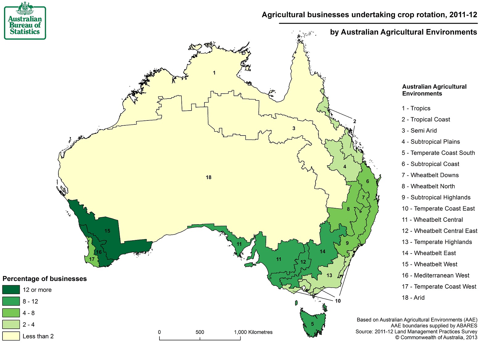 Crop management practices in Australia were undertaken by 37,000 agricultural businesses (27% of all agricultural businesses) in 2011-12.