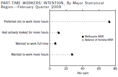 In the Balance of Victoria MSR, the total number of part-time workers in February quarter 2009 was 234,600, an increase of 23,300 (11.0%) since February quarter 2008. The majority of these part-time workers (72.3%) preferred not to work more hours.