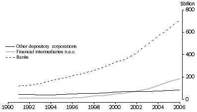 13. Table 2 shows that at 30 June 2006, 70% ($707.8b) of household sector liabilities were borrowings from banks, and 19% ($188.4b) were borrowings from financial intermediaries n.e.c.. Borrowings from financial intermediaries n.e.c., was attributable to securitisation programs to finance mortgage borrowing. See paragraph 17 for further detail.