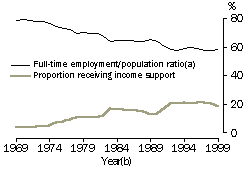 For example, the increase in the proportion of workforce-age men receiving income support payments is primarily associated with the decline in rates of full-time employment (seeAustralian Social Trends 2001, Trends in employment population ratios). Between 1969 and 1999, the proportion of workforce-age men who were unemployed or working part-time, and receiving unemployment payments, increased from less than 1% to 8%, accounting for almost half of the overall increase (from 4% to 19%) in workforce-age men receiving income support. In addition, the proportion of workforce-age men who were unable to work, and were receiving disability or sickness payments, increased from 2% to 6%, accounting for more than a quarter of the overall increase between 1969 and 1999. PROPORTION OF WORKFORCE-AGE POPULATION RECEIVING INCOME SUPPORT PAYMENTS