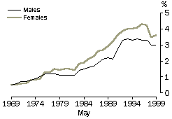The proportion of women receiving unemployment payments and disability/sickness payments also increased, reflecting the increasing proportion of women who do not have a partner whose income may otherwise have made them ineligible for income support regardless of their own health or employment status. The increase in the proportion of workforce-age women receiving wife, carer or partner payments reflects the decline in full-time employment among their partners. The proportion of both men and women receiving student assistance increased considerably between 1969 and 1999, from less than 1% for both men and women to 3% and 4% respectively, reflecting trends in full-time participation in education during the period (see Australian Social Trends 2000, Beyond compulsory schooling). WORKFORCE-AGE RECIPIENTS OF INCOME SUPPORT PAYMENTS, 1999