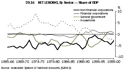 Graph 29.16 shows net lending by institutional sector as a proportion of GDP. A positive percentage for a sector indicates that it is a net lender to other sectors; a negative percentage indicates that it is a net borrower. The household sector has been a net lender for most years. As a proportion of GDP, net lending by households peaked in 1974-75 at 9.1%. Since then it has trended downwards, and in five of the last seven years the household sector has been a net borrower. Non-financial corporations have been net borrowers over the whole period from 1965-66 to 1999-2000, and the amounts borrowed have fluctuated significantly from year to year. As a proportion of GDP, their net borrowing was 3.0% in 1999-2000. After being a net borrower thoughout the 1980s, the financial corporations sector returned to being a net lender in 1990-91 and has remained so since then. In 1999-2000 financial corporations net lending represented 0.2% of GDP. After recording a record level of borrowing in 1992-93 as a proportion of GDP (5.8%), general government borrowing has steadily declined, and from 1997-98 this sector became a net lender. In 1999-2000 general government net lending represented 0.7% of GDP.