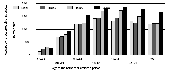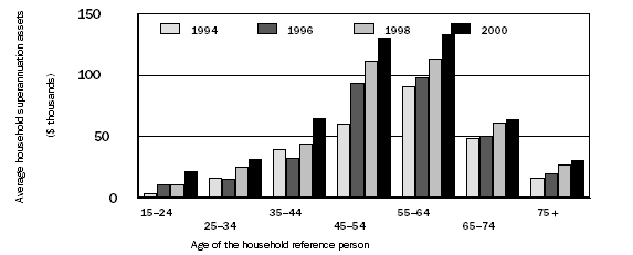 Average superannuation assets rose significantly between 1994 and 2000 for middle-aged and older households. See graph 3.
