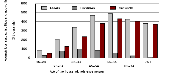 The value of net worth also depends on the liabilities which a household has accrued. Graph 4 illustrates how average total assets, liabilities and net worth were distributed across reference person age groups, in 2000. Assets and net worth are distributed in very similar ways, while liabilities peak in younger and middle age groups, before households have paid out major loans such as those for their home and/or car. Similar patterns were observed in each of the years studied.