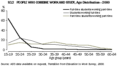 Combinations of study and work Most people combining study and work fall into two main groups: full-time students who undertake part-time work, and full-time workers undertaking part-time study. In 2000, 42% and 44% of working students respectively fell into these categories. While these combinations of study and work were also predominant in 1990, the proportion of full-time students who work part-time has increased (from 34%), while the proportion of part-time students working full-time has decreased (from 53%). In 2000, close to 12% of working students were combining part-time work and part-time study (table S3.1). Relatively few students (less than 3%) both worked and studied on a full-time basis, and for the remainder of this article data relating to this group will be combined with full-time workers who study part-time. The ages of students across the different combinations of study and work varied considerably. In 2000, most full-time students working part-time (89%) were aged under 25 years (graph S3.2). However, students working full-time were typically older (63% were aged 25 years and over), while part-time students working part-time were distributed in similar proportions across the ages 15 to 54 years. S3.1 PEOPLE COMBINING STUDY AND WORK