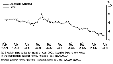 The number of unemployed persons (trend) in Western Australia fell by 8.4% (3,100 persons) to 33,800 persons in the three months to February 2007. This fall was mainly driven by fewer unemployed females, declining by 2,900 persons (15.6%), while male unemployment fell by only 200 persons. With the total number of unemployed persons declining in the state, the unemployment rate for Western Australia fell from 3.3% in November 2006 to 3.0% in February 2007 in trend terms. Nationally, the unemployment rate remained unchanged at 4.6% over the same period.