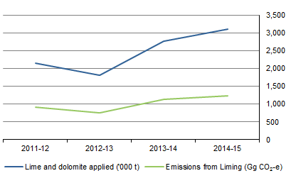 The use of fertilisers became a significant topic of interest in 2009 with the emergence of the Carbon Farming Initiative (CFI) and also the National Greenhouse Gas Inventory. While flows to the atmosphere are not captured in this account, the GHG physical flow accounts presents data on carbon dioxide equivalent emissions from agricultural activities including use of fertilisers and liming. Lime and dolomite use in soils leads to carbon dioxide emissions as carbonate reacts with acid in the soils to produce bicarbonate and eventually leading to the production of CO2 and water. While increased use of lime can increase carbon dioxide emissions, there is evidence to suggest increasing soil pH via liming can decrease nitrous oxide fluxes from sandy, acidic soils following summer rainfall (footnote 1). GRAPH 4. APPLICATION OF LIME AND DOLOMITE AND EMISSIONS FROM LIMING, Australia, 2011-12 to 2014-15