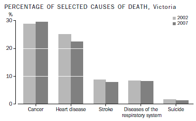 There were 33,930 Victorian deaths registered in Australia in 2007. This represented an increase of 158 deaths (0.5%) over the number registered in 2002. Almost 30% of deaths in 2007 were due to Cancer (Malignant neoplasms, ICD codes C00-C97) (29.5%, compared with 28.9% in 2002). The next most common underlying cause of death was Heart disease (ICD codes I05-I09, I11, I13, I20-I25, I27, I28, I30-I52) with 22.5% of deaths in 2007 (25.1% in 2002). Between 2002 and 2007, the number of deaths due to heart disease decreased by 10.0%, while deaths due to cancer increased by 2.7%. Stroke (Cerebrovascular diseases, ICD codes I60-I69), Diseases of the respiratory system (ICD codes J00-J99) and Suicide (Intentional self-harm, ICD codes X60-X84, Y87.0) were the underlying causes in 7.9%, 8.2% and 1.3% respectively of all deaths in 2007.
