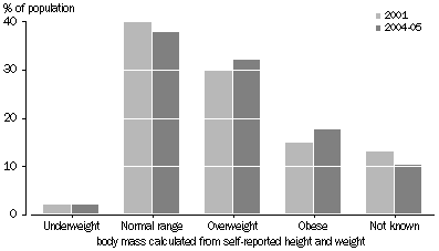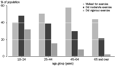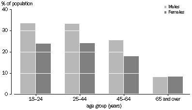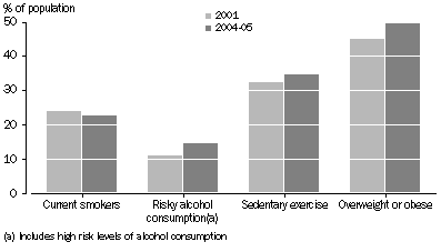 ABOUT THIS PUBLICATION RISK FACTORS OF ADULTS, SA, 2001 AND 2004-05 Source: National Health Survey, Summary of Results: State Tables, 2004-05 (cat. no. 4362.0) and National Health Survey: Summary of Results, 2001 (cat. no. 4364.0). SMOKING In SA and Australia, nearly one quarter (23%) of the adult population were current smokers in 2004-05, nearly one half (47%) had never smoked regularly and the remainder (30%) were ex-smokers. In contrast, current smoker levels ranged from 18% of adults in the ACT to 25% of adults in Queensland and Tasmania, while the proportion having never smoked varied from 42% in Tasmania to 50% in the ACT. In SA, 91% of the current smokers were regular daily smokers and the other 9% smoked less often than once a day. The prevalence of smoking was higher amongst males than females in SA with 26% of adult males and 19% of adult females being current smokers. The following graph shows that the prevalence of smoking for males was higher than that for females across the 18-24, 25-44 and 45-64 year age groups. The graph also shows that the prevalence of smoking was highest in the younger age groups with 33% of males and 24% of females in both the 18-24 and 25-44 year age groups being current smokers compared with just 8% of males and 8% of females aged 65 years and over. CURRENT SMOKERS BY SEX AND AGE GROUP, SA, 2004-05 In terms of the index of (socio-economic) disadvantage, the first quintile refers to the most disadvantaged group while the fifth quintile refers to the least disadvantaged group. The latest NHS found that South Australians residing in areas that are in the lowest quintile were more likely to smoke (31%) than people residing in areas in the highest quintile (11%). South Australians without private health insurance were more likely to smoke (29%) than those with private health insurance (14%). ALCOHOL CONSUMPTION Respondents to the 2004-05 NHS were asked about their daily alcohol consumption in the seven days prior to interview. If they did not consume any alcohol during the reference period, they were asked when they last consumed alcohol. Results indicate that alcohol was consumed in the previous week by 65% of South Australian adults, and more than one week ago but less than 12 months ago by 19% of adults. A further 7% of South Australian adults had not consumed any alcohol for at least 12 months or longer, while 7% of adults had never consumed alcohol. People were classified to a health risk level (low risk, risky, or high risk) based on their consumption of alcohol during the previous week. Almost 15% of South Australian adults were estimated to have consumed alcohol at a risky or high risk level in 2004-05, up from 11% in 2001. Nationally, risky or high risk consumption was reported by 14% of Australian adults in 2004-05, up from 11% in 2001. For other jurisdictions, the prevalence of risky or high risk levels of alcohol consumption ranged from 11% in Tasmania to 16% in Western Australia in 2004-05. In SA in 2004-05, proportionally more males than females consumed alcohol at risky or high risk levels (16% and 13% respectively). South Australians from households with incomes in the highest quintile were more likely to consume alcohol at risky or high risk levels (22%) than those in the lowest household income quintile (9%). From another perspective, people in the highest (fifth) quintile for socio-economic disadvantage were more likely to be risky drinkers (19%) than those in the lowest (or first) quintile (8%). EXERCISE In 2004-05, 35% of South Australian adults were sedentary, 38% exercised at low levels, 22% exercised at moderate levels and 5% at high levels. Levels of exercise were determined by the frequency, intensity and duration of exercise for sport, recreation or fitness but were not necessarily indicative of total physical activity because other physical activities (for example, work and housework activities) were excluded. Equal percentages of males and females were sedentary in SA (both 35%) and in Australia (both 34%). The ACT had the lowest percentage of sedentary adults at 24%, while elsewhere, levels ranged from 31% in Western Australia to 36% in New South Wales and Queensland. Just over one half (51%) of the South Australian adult population walked for exercise in the two-week reference period. Another 34% did moderate exercise (that is, they exercised at a level which caused a moderate increase in heart rate or breathing) while 13% did vigorous exercise (that is, they exercised at a level which caused a large increase in heart rate or breathing). Proportionally fewer males walked than females (46% and 55% respectively). However, a higher proportion did moderate exercise (37% of males and 30% of females) and a higher proportion did vigorous exercise (16% of males and 10% of females). The following graph shows that percentages of populations exercising at moderate and vigorous levels decreased with age; however, walking was highest for persons in the 45-64 year age group. TYPES OF EXERCISE OF ADULTS BY AGE GROUP, SA, 2004-05 BODY MASS In 2004-05, adults were asked their height and weight (to enable the calculation of their body mass index) and also whether they considered themselves to be overweight, of acceptable weight or underweight. One tenth (10%) of South Australian adults in the survey did not know or declined to report their height or weight, compared with 8% of adults nationally. Height and weight details were not obtained from twice as many South Australian females as males (14% and 7% respectively). Based on self-reported height and weight, 2% of South Australian adults were underweight in 2004-05, 38% were of normal weight, 32% were overweight and 18% were obese. These figures were similar to those for Australia, the other states and the ACT. In SA in 2001, a statistically significantly lower percentage of adults were obese (15%), whereas similar percentages were underweight (2%), normal weight (40%) and overweight (30%).