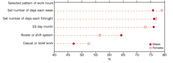 Source: Working Arrangements, Australia, August 1997 and November 2000 (ABS cat. no. 6342.0). Male and female employees There were differences in certain employment arrangements between male and female employees in 2000. Male employees were more likely than female employees to work overtime on a regular basis (39% compared with 25%), to work at night or on the weekend (69% compared with 57%), to have variable start and finish times (38% compared with 29%), and to be entitled to rostered days off work (24% compared with 16%). Female employees were more likely to have a pattern of working days that varied from week to week (16% compared with 12% of male employees). Some of these differences between male and female employees may reflect differences in the number of hours worked each week. In 2000, male employees were more likely to be employed full-time (working 35 hours or more per week), and female employees were more likely to be employed part-time (working less than 35 hours per week). Full-time employees were considerably more likely than part-time employees to be entitled to rostered days off work (26% compared with 5%), and to regularly work overtime (41% compared with 12%). Conversely, part-time employees were more likely to have a pattern of working days that varied from week to week (26% compared with 9% of full-time employees). PROPORTION OF MALE AND FEMALE EMPLOYEES WORKING UNDER SELECTED ARRANGEMENTS(a) - 2000 (a) In the main job of people who are an employee in their main job. Source: Working Arrangements, Australia, November 2000 (ABS cat. no. 6342.0) except ‘Worked at night or on the weekend in the previous four weeks’ which has been sourced from the ABS 2000 Survey of Employment Arrangements and Superannuation. Overtime In 2000, around 2.5 million employees (33%) regularly worked overtime in their main job. At least two-thirds of these employees had been, or expected to be, reimbursed in some way for the most recent period of overtime that they worked; 38% by extra pay, 21% by inclusion of overtime in their salary package, 5% by receiving time off work in lieu of payment, and 2% by other means. One-third of all employees who usually worked overtime were not, or did not expect to be, reimbursed by any of these methods for the most recent period of overtime that they worked. In 1993, 40% of employees who regularly worked overtime in their main job were reimbursed by extra pay for their most recent period of overtime worked. As in 2000, 5% received time off in lieu of payment. METHOD OF REIMBURSEMENT FOR EMPLOYEE(a) OVERTIME(b) - 2000 (a) Employees who worked overtime on a regular basis in their main job. (b) For the most recent period of overtime worked in their main job. Source: Working Arrangements, Australia, November 2000 (ABS cat. no. 6342.0). Preferred work hours and patterns One indicator of job satisfaction is the extent to which actual working arrangements mirror preferred working arrangements. In the ABS 2000 Survey of Employment Arrangements and Superannuation, survey respondents were asked whether they would prefer to 'Work less hours and earn less', 'Work more hours and earn more', 'Work the same amount as now' or whether they had 'No preference'. While 'Work less and maintain current earnings' was not a preference option, interviewers recorded this response when it was given. In total, 6% of employees responded to the question in this way. In 2000, nearly two-thirds of people who were employees in their main job preferred to work the same amount of hours as they actually worked in that main job. However, those who usually worked full-time in their main job were more likely to be working according to their preference than those who usually worked part-time. While the majority (61%) of part-time employees were working their preferred amount of hours, 34% preferred to work more hours and earn more. This preference to work more hours and earn more was strongest among those working less than 16 hours (40%) and generally weakened with increased usual weekly working hours. While 61% of those who usually worked more than 60 hours per week in their main job worked according to their preference, 6% preferred to work more hours and earn more, and 12% preferred to work less hours and earn less. EMPLOYEES' USUAL AND PREFERRED WORKING HOURS(a) - 2000