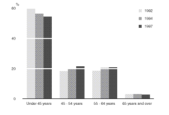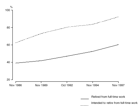 Steady increases in retirement scheme membership have been evident since the first time this information was collected. From a level of 38% in 1983, retirement scheme membership for those aged 45 and over who had retired from full-time work has risen to 60% in November 1997. These changes strongly reflect changes to superannuation legislation over the last 15 years. The number of retirement scheme members aged 45 and over who had retired from full-time work aged 45 or more was 1,256,800, an increase of 20% since November 1994. RETIREMENT SCHEME MEMBERSHIP, 1986 - 1997 In November 1997, the number of persons aged 45 and over intending to retire who were retirement scheme members was 1,943,400, an increase of 22% since November 1994. Most of this increase was seen in the increase in superannuation scheme membership, which rose from 82% in 1994 to 91% in 1997 for this group. INTEND TO RETIRE In November 1997, there were 2,103,900 persons aged 45 and over who intended to retire from full-time work. In addition, there were 18,500 persons who had only ever worked part-time and intended to retire from part-time work. Of the 1,412,300 males who intended to retire from full-time work: