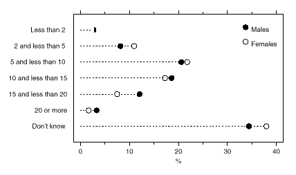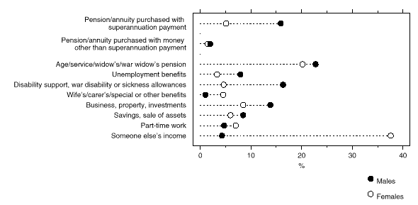 EXPECTED TIME UNTIL RETIREMENT FROM FULL-TIME WORK BY SEX (years) Of the group who intended to retire from full-time work, 600,900 (29%) indicated that they intended to work part-time after leaving their full-time job. The remaining 1,503,000 intended to retire from the labour force. EXPECTED MAIN SOURCE OF INCOME AT RETIREMENT FROM FULL-TIME WORK Those aged 45 and over who intended to retire from full-time work showed different responses from the retired group regarding their income sources in retirement. Of the 2,103,900 persons who intended to retire from full-time work: