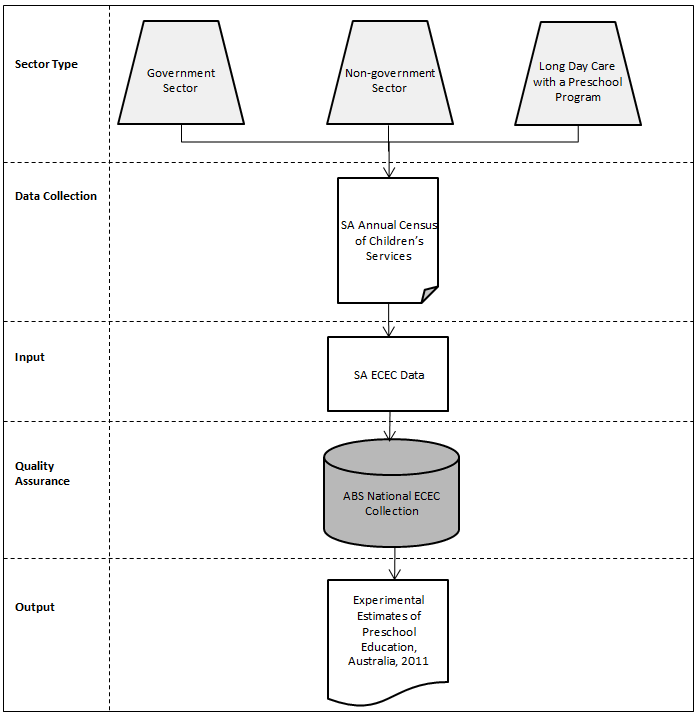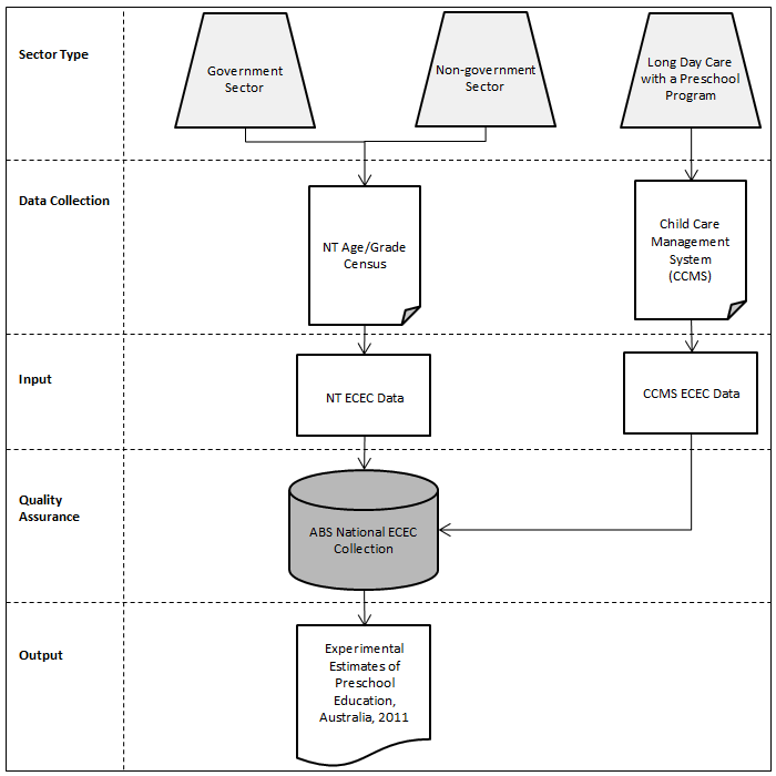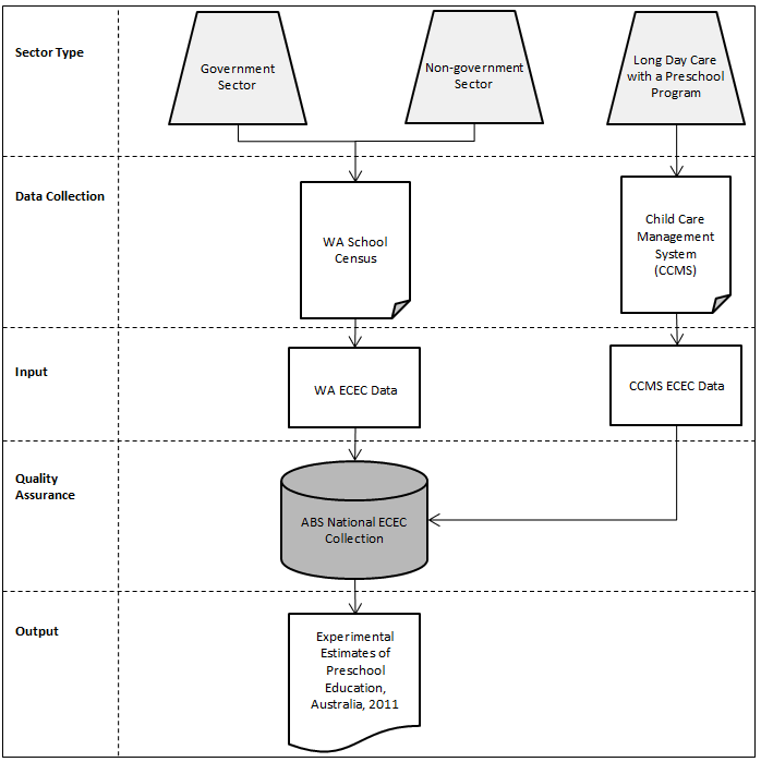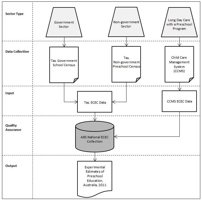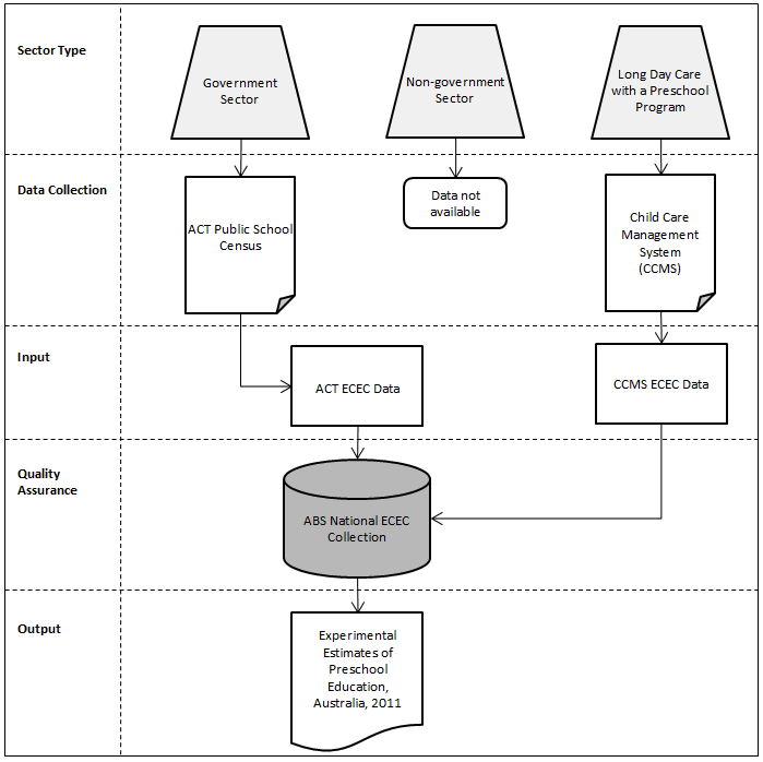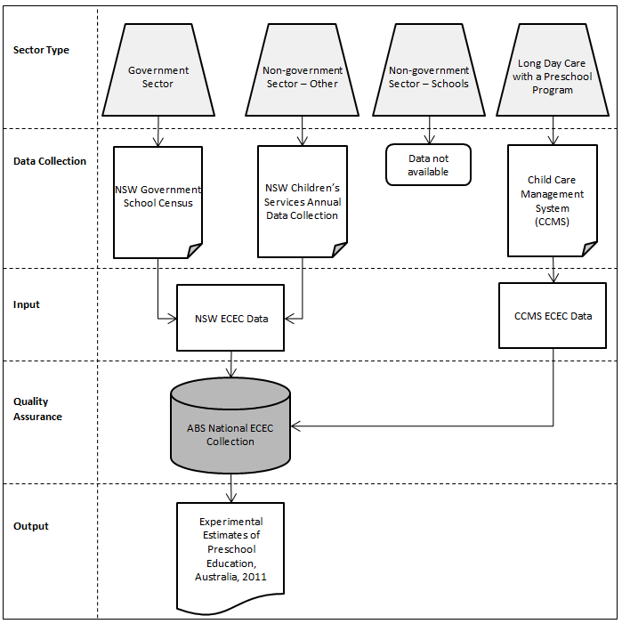 Figure 2.2: Data Sources – New South Wales A data quality statement for the NSW Government School Census and the NSW Children’s Services Annual Data Collection can be found in Chapter 5, Jurisdictional Data Quality Statements – New South Wales. A data quality statement for the Child Care Management System can be found in Chapter 5, Jurisdictional Data Quality Statements – Australian Government Figure 2.3: Data Sources – Victoria A data quality statement for the Victorian August Data Collection and the Confirmed Kindergarten Funding Data Collection can be found in Chapter 5, Jurisdictional Data Quality Statements – Victoria Figure 2.4: Data Sources – Queensland A data quality statement for the Queensland Early Childhood Education and Care Services Census can be found in Chapter 5, Jurisdictional Data Quality Statements - Queensland Figure 2.5: Data Sources – South Australia A data quality statement for the South Australian Annual Census of Children’s Services can be found in Chapter 5, Jurisdictional Data Quality Statements – South Australia. Figure 2.6: Data Sources – Western Australia A data quality statement for the Western Australian School Census can be found in Chapter 5, Jurisdictional Data Quality Statements – Western Australia. A data quality statement for the Child Care Management System can be found in Chapter 5, Jurisdictional Data Quality Statements – Australian Government. Figure 2.7: Data Sources – Tasmania A data quality statement for the Tasmanian Government School Census and the Non-government Preschool Census can be found in Chapter 5, Jurisdictional Data Quality Statements – Tasmania. A data quality statement for the Child Care Management System can be found in Chapter 5, Jurisdictional Data Quality Statements – Australian Government. Figure 2.8: Data Sources – Northern Territory A data quality statement for the Northern Territory Age/Grade Census can be found in Chapter 5, Jurisdictional Data Quality Statements – Northern Territory. A data quality statement for the Child Care Management System can be found in Chapter 5, Jurisdictional Data Quality Statements – Australian Government. Figure 2.9: Data Sources – Australian Capital Territory A data quality statement for the ACT Public School Census can be found in Chapter 5, Jurisdictional Data Quality Statements – Australian Capital Territory. A data quality statement for the Child Care Management System can be found in Chapter 5, Jurisdictional Data Quality Statements – Australian Government.
