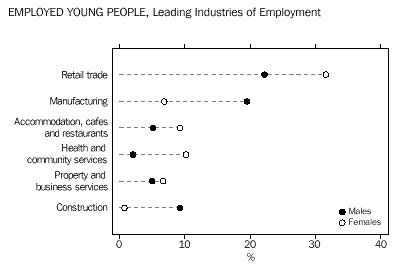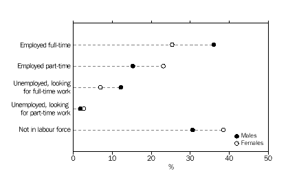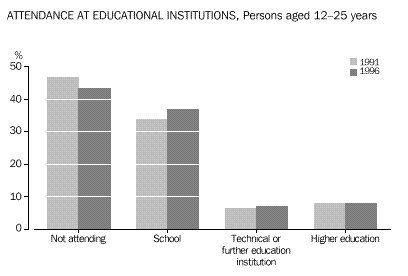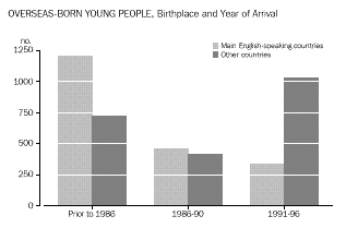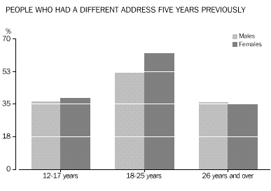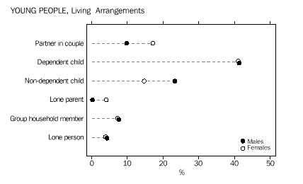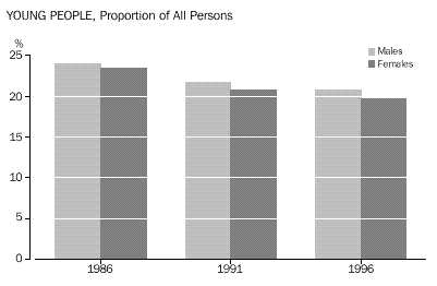 INTRODUCTION Sex and age There were slightly more males than females in the 12-25 years age group (46,673 compared with 45,792). Males slightly outnumbered females at all ages up to 22 years, after which the number of females began to exceed the number of males. Among all people counted in Tasmania, females outnumbered males by 6,918. Geographic In 1996, the highest numbers of young people were in the largely urban Statistical Subdivisions of Greater Hobart (39,941), Greater Launceston (20,552) and Burnie-Devonport (14,734). The areas with the highest concentrations of young people were also the Greater Hobart and Greater Launceston Statistical Subdivisions, where they represented 21% of all persons. Movement Young people reported being more mobile than older people. Almost 48% of 12-25 year-olds reported living at a different address than five years previously, compared with only 35% of older people. A similar pattern was evident for residential movement within the previous twelve months, with 26% of young people and only 13% of older people being at a different address. Most of this movement had taken place within Tasmania. Among people who had moved within the previous five years, 88% of 12-25 year-olds, and 84% of older people, had moved within the State. Young females were more likely to have moved than young males. Just over half of young women reported living at a different address five years ago, compared with 45% of young men. For the older population, 36% of males and 35% of females were living at a different address from five years ago. CHAPTER 3 CULTURAL DIVERSITY Indigenous people In the 1996 Census, 4,102 or 4% of young Tasmanians reported that they were of Indigenous origin. This proportion is higher than any State or Territory other than the Northern Territory (32%), and higher than the national average among young people (2.7%). The 15-17 years age group had the highest proportion of Indigenous people (5%) while the proportion of Indigenous people in the older population (aged 26 years and over) was only 2%. Overseas-born Tasmania had the lowest proportion of young people born overseas of any State or Territory. Just under 5% (4,484) of 12-25 year-olds were born overseas, compared with 19% in Western Australia. In comparison, 14% (40,847) of older people (aged 26 years and over) were born overseas. Fewer than 3% of young Tasmanians had been born in non-main English-speaking countries, the lowest proportion among any of the States and Territories. Countries of birth Nearly half (48% or 2,161) of overseas-born people aged 12-25 years originated from the main English-speaking countries (Canada, Ireland, New Zealand, South Africa, the United Kingdom and the United States of America ). Among older people (aged 26 years and over) 63% (25,901) were born in the main English-speaking countries. For those young Tasmanians who arrived in Australia prior to 1986, the highest proportion of young people were born in the United Kingdom. Among young people who arrived between 1986 and 1990, the highest proportion were born in New Zealand (20%), closely followed by the United Kingdom (19%). Of those who arrived more recently (1991-96), 18% had migrated from Malaysia, 11% from New Zealand and 7% from both the United Kingdom and Singapore. The number of young Tasmanians who had arrived from a non-main English-speaking country increased from 722 prior to 1986 to 1,028 between 1991 and 1996. Birthplace of parents Of 12-25 year-olds born in Australia, 68,853 or 81% had both an Australian-born mother and father. Another 6,158 (7%) of young Tasmanians born in Australia had at least one parent born in a country other than the main English-speaking countries. Only 2% (1,558) of young Tasmanians born in Australia had both parents born in a non-main English-speaking country. Languages spoken at home Just over 3% of young Tasmanians spoke a language other than English at home. Of these young people, almost 18% spoke a Chinese language. Another 11% spoke Greek. Among people aged 26 years and over, the most common language spoken at home other than English was German (15%). Proficiency in English The majority (95%) of young Tasmanians reported speaking English only. Of those young people who spoke another language, 89% reported that they spoke English very well or well. CHAPTER 4 LIVING ARRANGEMENTS Marital status Almost 18% of 15-25 year-olds in Tasmania were married - 8% in a registered marriage, and 9% in a de facto marriage. Young females were more likely than young males to be in a partnership (22% compared with 13%). Living arrangements Over 41% of 12-25 year-olds were living with their parents as dependent children. Another 23% of young males, and 14% of young females, were living as non-dependent children with their parents. Young women were more likely than young men to have moved from the family home, forming partnerships and their own families (21% compared with 10% of young males). Among Indigenous young people, higher proportions (24% of females and 12% of males) had formed partnerships, or their own families. For young people born in non-main English-speaking countries, about 46% were living as dependent children with their parents. A high proportion (18%) were living in group households, perhaps reflecting the high numbers of overseas students in this population. Type of dwelling About 3% of 12-25 year-olds in Tasmania had spent census night in a non-private dwelling. Large numbers of these young people were in boarding schools or residential colleges (1,541), or staying at hotels and motels (575). Another 345 young people reported having no usual address. Type of tenure About 61 % of young people occupied dwellings which were owned or being purchased, compared with almost three-quarters (74%) of people aged 26 years and over. Almost one-third (32%) of young people were living in rented dwellings, compared with fewer than 18% of older people (aged 26 years and over). In comparison, 47% 