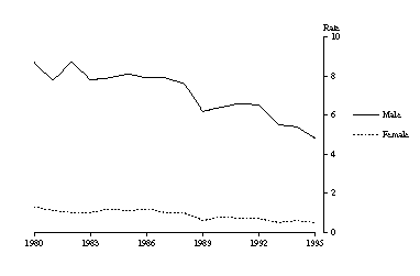 Among males, the standardised firearms death rate decreased from 8.7 deaths per 100,000 in 1980 to 4.8 in 1995, while the much lower female rate decreased from 1.3 deaths per 100,000 to 0.5 over the same period. Most of the decline in the rates occurred after 1988. These declines were evident for each category of firearm death and for all age groups (see tables 10 and 12). STANDARDISED FIREARM DEATH RATES(a), BY SEX (a) Standardised per 100,000 of the 1991 population (see paragraph 9 of the Explanatory Notes). AGE VARIATION Age-specific firearm death rates were lowest among children and rose with age, peaking in the 15-34 years age group. Rates then declined until ages 55 and over where death rates began to rise again. This pattern reflects the pattern for male deaths. About 42% of firearm deaths among males occurred in the 15-34 years age group, with deaths among those 65 years and over accounting for about 13% of all firearm deaths (see table 11). Age-specific death rates were higher for males than females in all age groups. While females in general followed a pattern similar to males, the deaths were distributed over a wider span of adult age groups. The type of firearm death varied with age. Over the reference period 210 firearm deaths of children under 15 years were registered. Of these, the largest proportion were due to homicides (46%), followed by accidents (30%). In the 15-24 years age group, the majority (78%) of firearm deaths were suicides, while accidents (7%) ranked third behind homicides (12%). This pattern remained the same in the adult age groups. While homicides ranked second in all adult age groups, the proportion was highest for those aged 25-44. At older ages (55 years and over) the proportion of suicides increased further while the proportion of homicides decreased. TYPE OF DEATH AS A PROPORTION OF FIREARM DEATHS, BY AGE GROUP, 1980 TO 1995