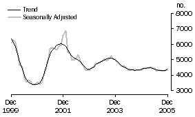 The number of finance commitments for the purchase of new dwellings for owner occupation (seasonally adjusted) rose by 2.3% in December 2005 compared with November 2005, following a fall of 2.5% in November. The trend series rose by 2.3% in December 2005.