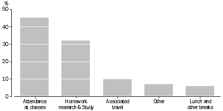 The time spent on education is made up of different associated activities. In 1992, approximately 45% of time spent on education was for attendance at educational/vocational courses, 32% of time spent was on homework, research and study, 10% was on associated travel and 6% was on lunch and other breaks.