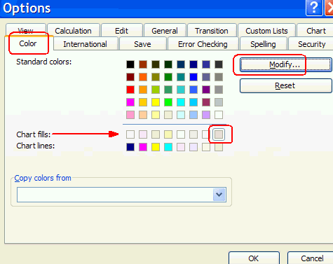 • colours can be set by going to <Tools> then <Options> and clicking on the "Color" tab. You need to select one of the colours in the palette and then select "Modify", as shown in Diagram 2.1. Choose the "Custom" tab and type in "222" or "244" to all three components of the colour model, as shown in Diagram 2.2.