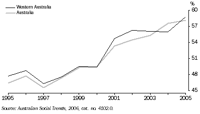 The overall increase in educational attainment in Western Australia has been supported by high levels of participation in education and training. Between 1995 and 2005, the proportion of 15-19 year olds who were students in Western Australia rose from 65% to 70% (either in school or studying for a vocational or higher education qualification).