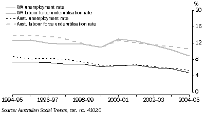 Another useful indicator is the labour force underutilisation rate. It provides a broader view of under-utilised labour than the unemployment rate by looking at the proportion of people in the labour force who are unemployed and underemployed (i.e. working less than 35 hours a week, but wanting and available to work more hours). Between 1994-95 and 2004-05, there was a 3.7 percentage point decrease in Western Australia's labour force underutilisation rate (from 12.6% to 8.9%), whereas nationally there was a 3.3 percentage point drop over the same period (from 13.8% to 10.5%).