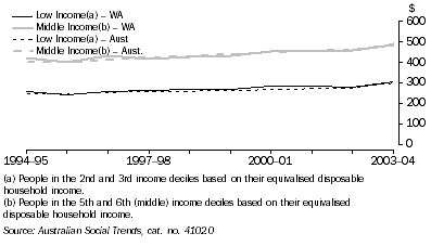 Society generally accepts that people should be able to enjoy some minimum material standard of living. Household income, as measured by average real equivalised disposable income, can indicate whether households, and particularly low income households, are experiencing economic hardship. In Western Australia between 1994-95 and 2003-04, the mean real equivalised weekly disposable income of low income households increased by 15% (from $260 to $300), marginally higher than the 14% rise of middle income households (from $420 to $480). Nationally, income growth of over 20% was recorded for both low and middle income households, greater than in Western Australia over the same period.