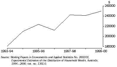 Average household net worth measures the net amount by which assets owned by Western Australian households exceeds their liabilities on average. Between 1993-94 and 1999-2000, average household net worth increased by 38% in Western Australia (from $181,000 to $250,000). Over the same period, national average household net worth rose by an estimated 28% (from $211,000 to $271,000).